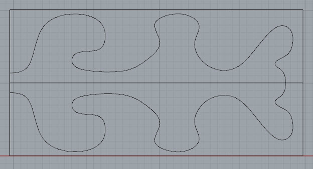 在矩形線框內繪製要貼到圓球體上的造形曲線,若要做對稱的造形,可以在矩形框中間先繪製一條參考中心線,繪製完一半的圖形後再鏡射、群組。