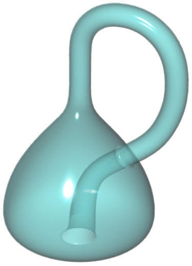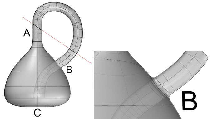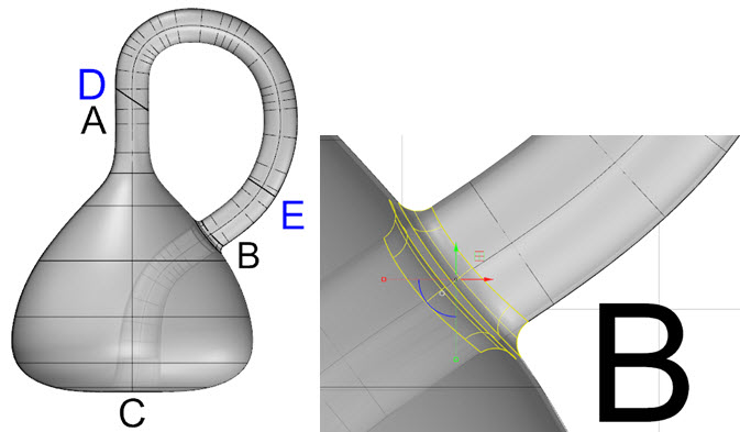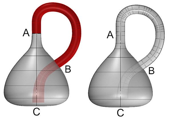 製作克萊因瓶時本體會分成兩個部分來進行(下圖左),接著使用合併曲面使管子與瓶身曲面合併(下圖右),此時A的銜接處已經消失得到單一曲面,這也是簡化曲面的方法之一,最後將曲面做偏移產生裡外的曲面。 |