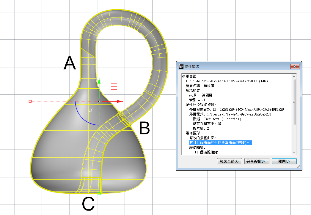 最後將C的部分做曲面混接後全部join起來,獲得一個有11個曲面的封閉多重曲面(實體),但這時候有11個曲面雖然是連續的曲面,但在後續渲染時可能會產生交接觸的問題,因此我們盡量將曲面簡化到最少。 |