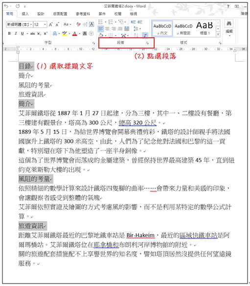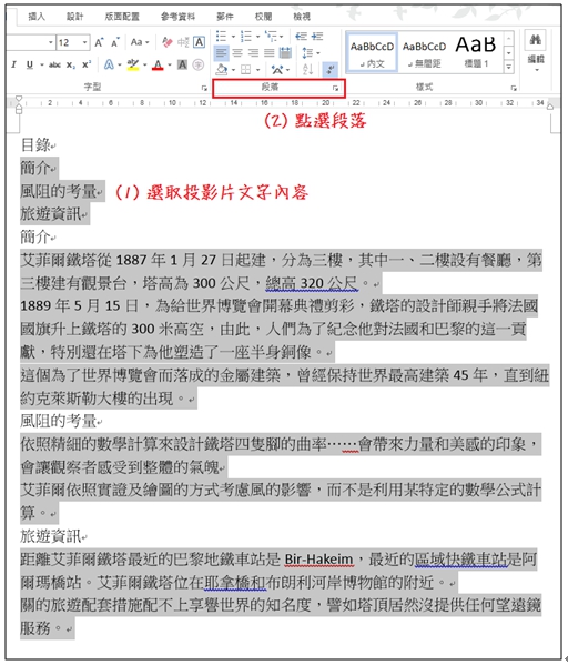 接著調整文字段落的階層,先選取每張投影片的標題文字,到「段落 / 大綱階層」選擇「階層1」。 |