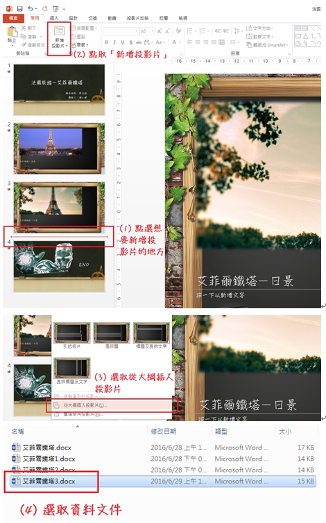 開啟製作中簡報,在簡報左邊的預覽窗格,點選想要新增投影片的地方,並到「新增投影片 / 從大綱插入投影片」選取資料文件。 |