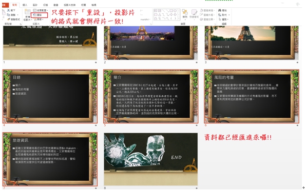 這時我們編輯過的資料就匯入近來囉,若是怕格式會跑掉,只要在點選「投影片 / 重設」,投影片的格式就會與投影片母片變得一致喔。 |