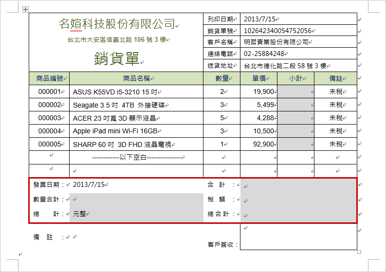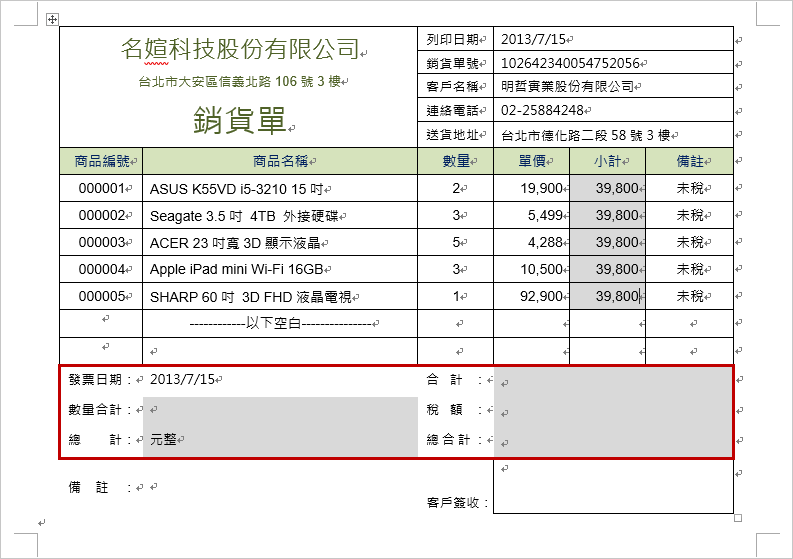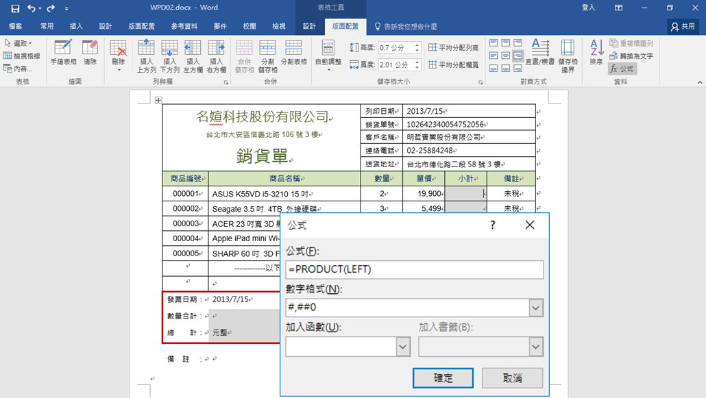 將游標放置於小計欄位,點選【表格工具】/【版面配置】/【資料】的「公式」按鈕,開啟【公式】視窗,小計=數量x單價,所以在「公式」欄位中輸入「=PRODUCT(LEFT)」,並選擇「數字格式」,按「確定」,即可計算出數值為39,800。 |