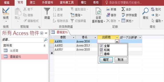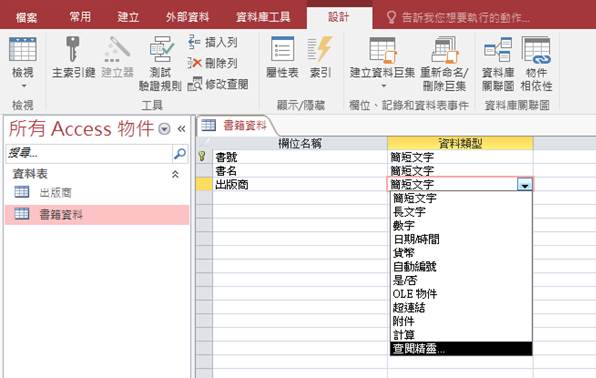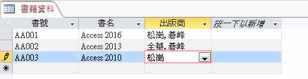 如下圖,若要在「出版商」的欄位重複輸入資料,一旦資料量龐大,將很難一一修改,使用查閱精靈,就可以以「選擇」的方式,避免一筆一筆重複輸入。