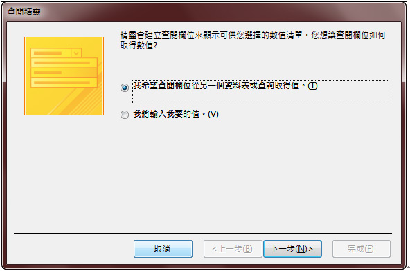 查閱精靈有兩種方式,可從另一個資料表或查詢來取得值,亦或者資料筆數少時可自行手動輸入,本範例以第一項方式「我希望查閱欄位從另一個資料表或查詢取得值。」示範 |
