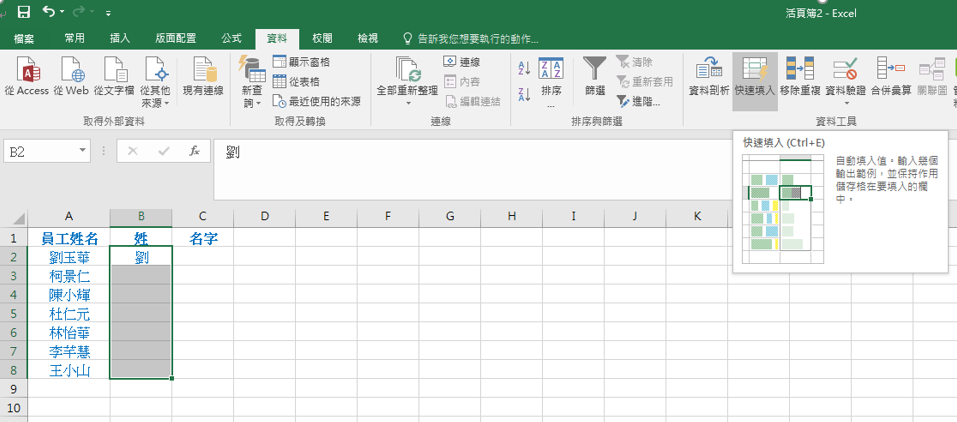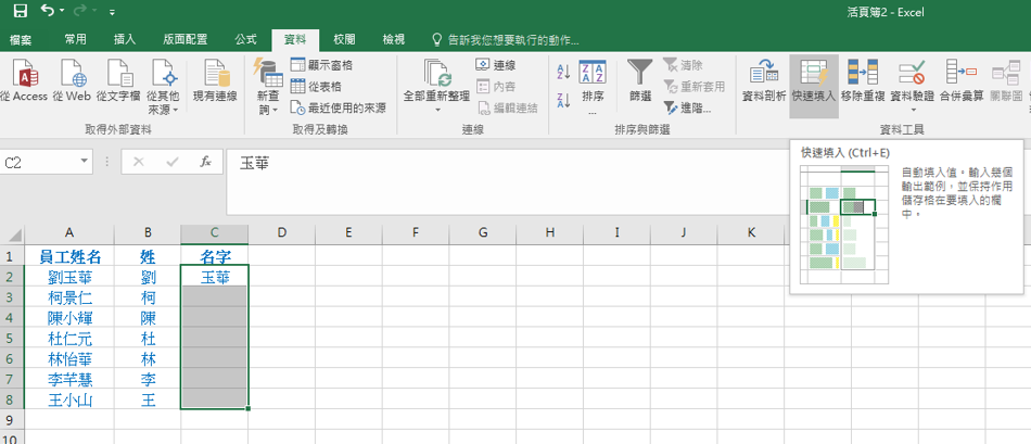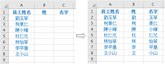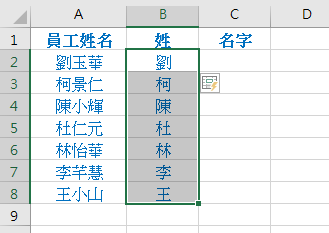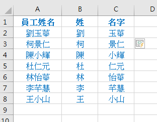 以下範例說明:將「員工姓名」的「姓」和「名字」獨立成新的二欄。