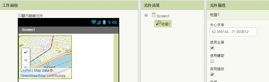 地圖組件提供有三個工具,可在App Inverntor 內操控地圖的邊界。第一個是一個銷定的機制,使地圖可以相於螢幕上的組件而移動。第二個是當解開鎖定時,可以移動景觀到地圖上每一個位置,而在這新的位置,點擊「設定為初始邊界」按鈕可以把它的屬性成為目前的地圖坐標。最後是如果地圖被移動一個不同位置時,例如要加上螢幕以外的地標,點擊「重設地圖初始邊界」按鈕可以重設地圖中心為開始的位置。