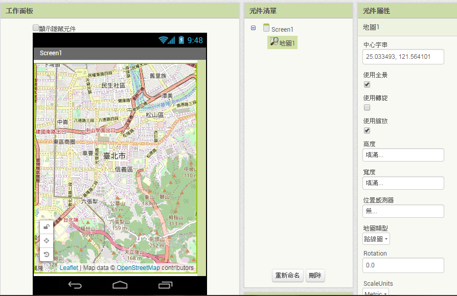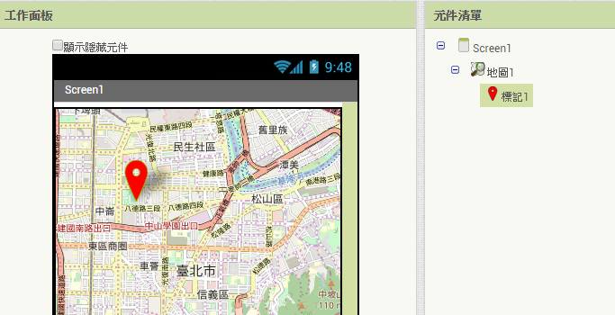 地圖元件是一個二維容器可以把一塊塊地圖展示成背景,並可以在地圖上加上多個標記元素來分辨地圖上的定點。這些一塊塊的地圖是由OpenStreetMap的參予者和United States Geological Survey 所提供。