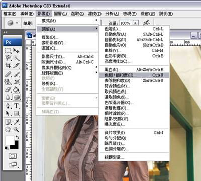 開啟照片檔案後,點選「影像 > 調整」功能中的「色相/飽和度」。