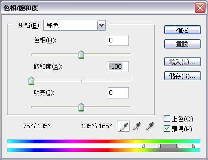 接下來選擇「編輯」中的「綠色」,將其飽和度設定為「-100」。由於這張照片的背景多為綠色與黃色色系,所以我們主要是要[去除]的顏色有黃色、綠色與青色。再將「編輯」中的「青色」、「藍色」,都依第3項的步驟,將其飽和度設定為「-100」。