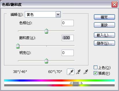 由於照片中的黃色背景區域的顏色與主體人物的膚色相近,我們必須多作一點處理。 選擇「編輯」中的「黃色」,將其飽和度設定為「-100」,並將底下的「相/飽和度調整滑桿」調整為如圖的數值。