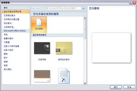 如果要重複建立相似的簡報,就可以使用範本做為基礎,因為範本會儲存您可以套用至簡報的設計資訊,讓您能夠一致地設定所有投影片內容的格式。在新版的Office PowerPoint 2007 更提供方便的範本下載功能。