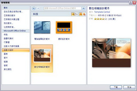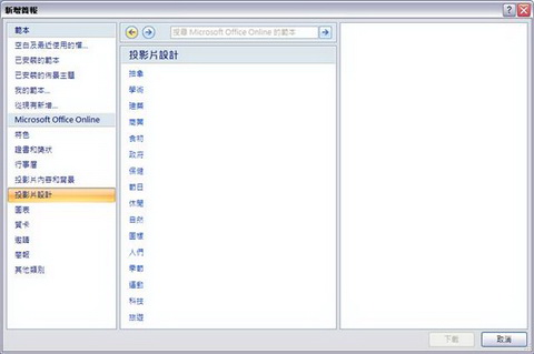 點選左側「Microsoft Office Online」之下的類別項目(如圖a),即可在中間的方框位置即時的預覽該類別的簡報範本外觀(如圖b),點選想要下載的範本後,再點選右下角的「下載」按鈕。