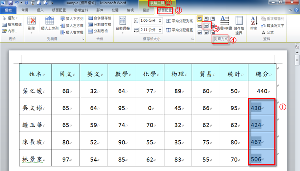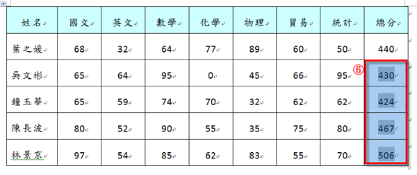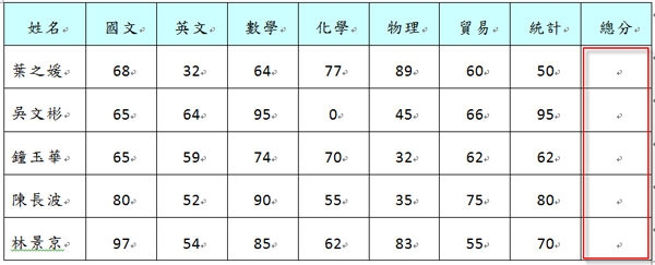 【Word 2010如何快速將表格中的數字欄位(如總分)進行加總】