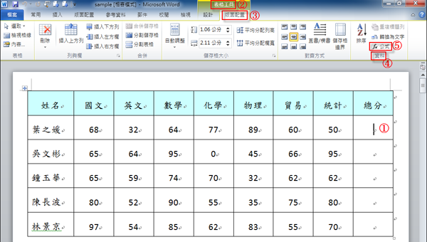 將游標停在第二列的最後一欄儲存格(如1),此時Word會自動開啟表格工具(如2),至版面配置頁籤(如3)的資料(如4),選擇fx公式(如5)開啟該對話方塊方塊見步驟二。