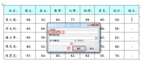 接續步驟一開啟『fx公式』對話方塊,因進行總分計算,所使用的公式為『=SUM(LEFT)』(如1),按下確定鈕(如2)。