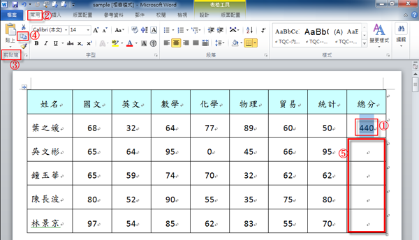 接續步驟二按下確定鈕後,第二列最後一欄儲存格即出現葉之媛總分合計為440,並將其複製(如1),至常用頁籤(如2)的剪貼簿(如3),並點選複製(如4),再選擇第三至六列的最後一欄(如5),按下鍵盤『Ctrl+V』(見步驟四)