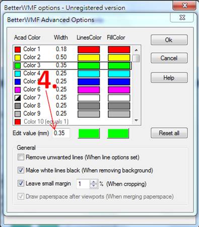 依序點選欲定義線條粗度之顏色,粗度輸入在Edit value(mm)中,全部設定完成按「OK」,回到主畫面。 本次示範定義如下: