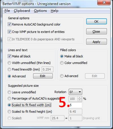 主畫面下方可重新設定貼上Word中的尺寸,本次示範定義為:貼上Word中的圖形寬度為5cm。BetterWMF會依照設定的線條粗度和尺寸自動進行比例縮放。