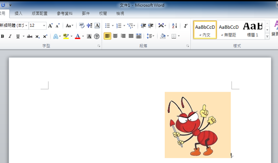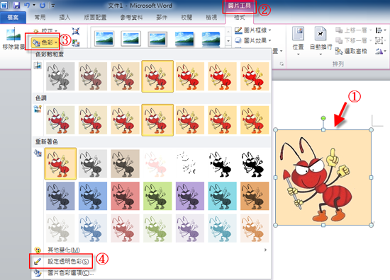 選取小螞蟻圖片(如1),此時Word會自動開啟圖片工具(如2),至「調整」頁籤中的「色彩」(如3),選擇設定透明色彩(如4)則會出現一隻畫筆見步驟二。