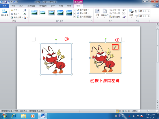 接續步驟一,出現一隻畫筆後,將畫筆停駐於小螞蟻圖片中的不透明色彩位置(如1),按下滑鼠左鍵(如2),原本的不透明色彩變成透明的囉(如3)。