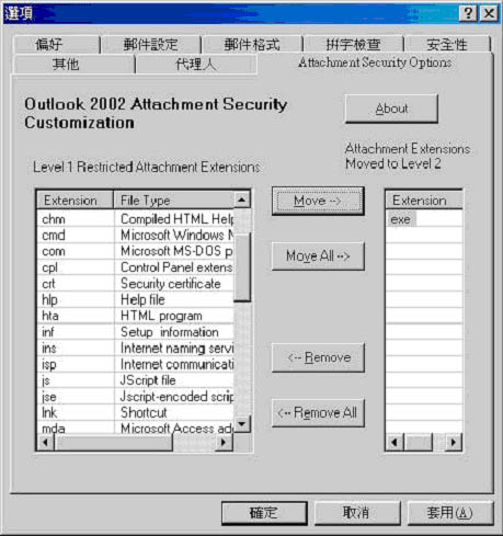 Outlook 2002/XP,你會發現一些附加檔無法被存取,如下圖: