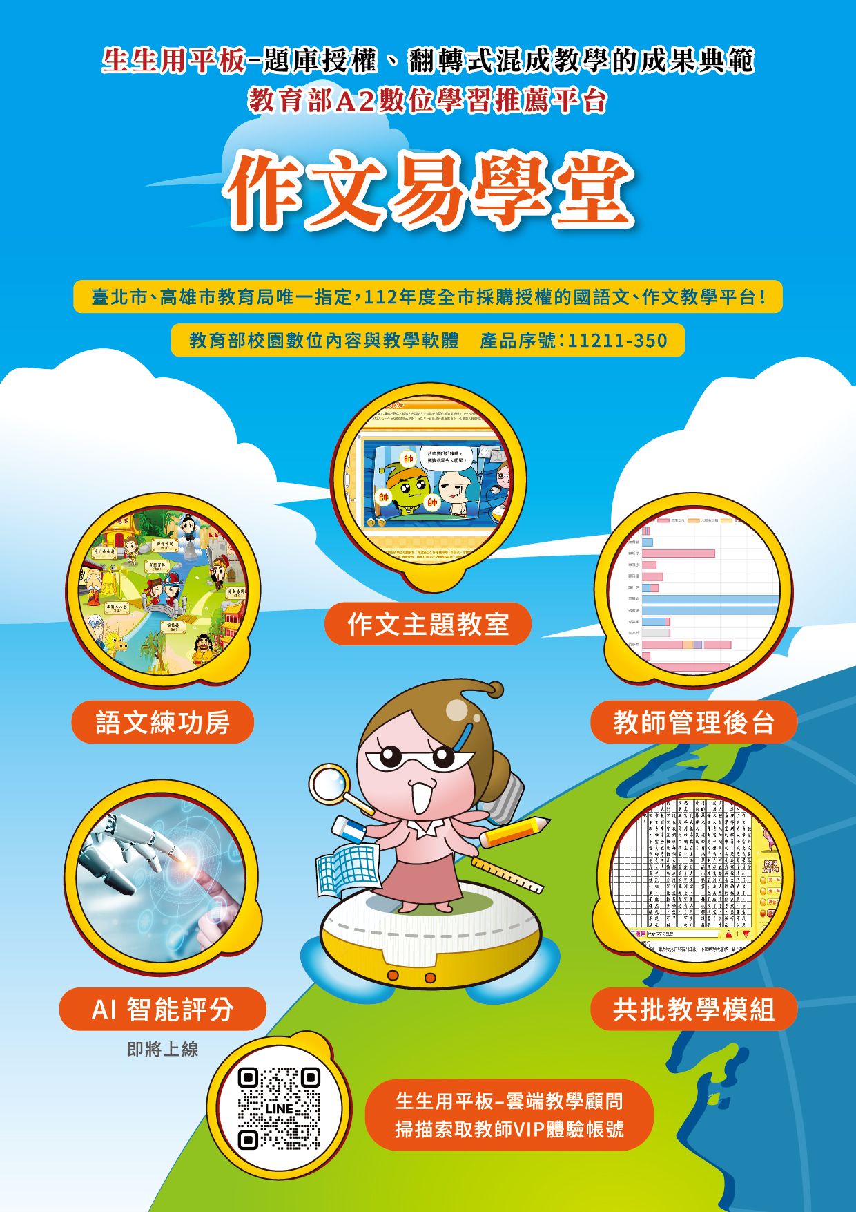「作文易學堂」是一個建置成熟,經實證有效的互動式國語文教學平台。學生、教師、管理者,每個人都會有自己的專屬帳號(已完成教育雲單一簽入)。完全符應「生生用平板計畫」、「均質化計畫」的績效指標與核心精神,適合三~九年級師生使用。多年來已協助六百多所學校的專案計畫申請與應用,深獲教育部與各縣市教育局青睞,成果斐然。