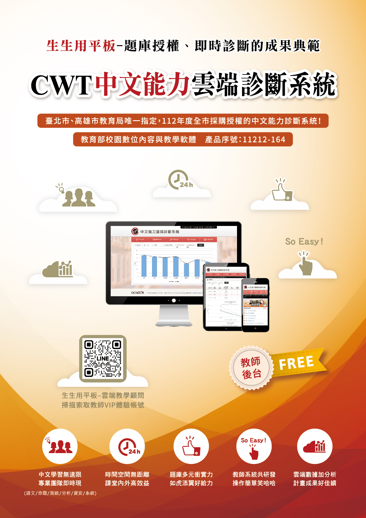 「中文能力雲端診斷系統」是一個建置成熟,經實證有效的中文能力輔教系統。學生、教師、管理者,每個人都會有自己的專屬帳號(已完成教育雲單一簽入)。完全符應「高教深耕計畫」、「生生用平板計畫」、「高中優質化計畫」的績效指標與核心精神。多年來已協助三百多所學校專案計畫申請與應用,成果斐然。