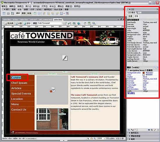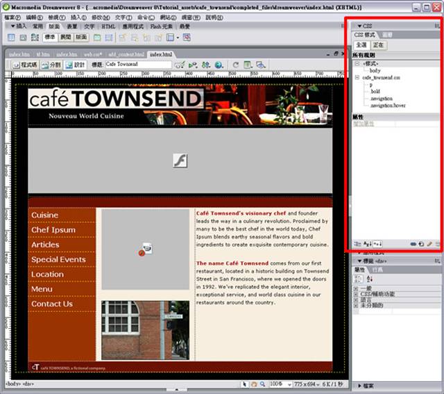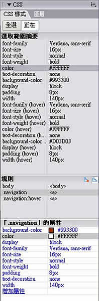 當第一次開啟「CSS 樣式」面板後,使用者可能會有些困惑,可以很明顯發現 Dreamweaver 8 的變更。「CSS 樣式」面板有兩個模式:「全選」和「正在」,好難理解啊!不過其實是非常簡單反而顯得難懂。